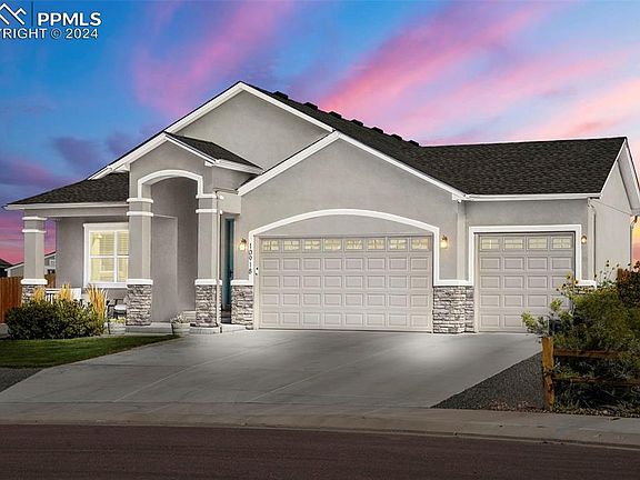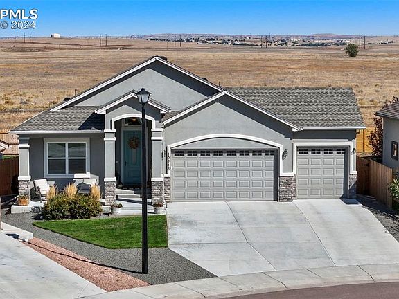 Why wait for new construction when you can own this meticulously maintained 2020 ranch home with a full finished basement? Offering breathtaking mountain and private views, this 4-bedroom, 3 full bathrooms contemporary residence boasts 3,154 finished square feet on a generous sized lot. Step inside to an inviting open floor plan featuring beautiful wood flooring, a floor-to-ceiling stack stone fireplace, and vaulted ceilings. The upgraded kitchen is a chef’s dream, complete with a gas stove top and stunning hood, double ovens, wine cooler, stainless steel GE appliances, a tile backsplash, granite countertops, and a large breakfast bar. Retreat to the spacious primary bedroom, which features high ceilings, a brand new upgraded 5- piece marble bathroom, and a door to the backyard patio. The luxurious 3-car garage includes a heating unit, 220V electricity outlet, insulated and drywalled, and ample storage space. The laundry room comes equipped with a washer and dryer for your convenience. There is modern finished basement that offers a versatile space perfect for a home office, guest suite, or entertainment area. Enjoy outdoor living in the beautifully landscaped backyard oasis, featuring a covered patio, extended concrete area, and a hot tub. The 10x10 shed matches the home’s aesthetic, providing extra storage for tools and toys. This ranch style home feels brand new and comes fully loaded with ceiling fans, window treatments, and a finished basement, making it the perfect move-in ready sanctuary. Don't miss your chance to experience the best of the Lorson community! Please call listing agent for details.
