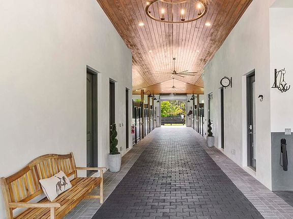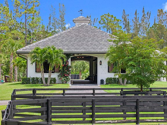 This stunning 5-acre farm in Fox Trail was built in 2022 with no expense spared. The property was expertly designed and sited on an east-west axis, an optimal layout to take advantage of tropical breezes.The main house features a three-way split floor plan with 4 bedrooms, an office and 4 bathrooms. There are Italian six foot plank porcelain floors throughout, two fireplaces, a chef's kitchen equipped with Wolf and Sub-Zero appliances, Italian Verona marble countertops and backsplash, luxurious polished nickel faucets, pot filler and accents, butler's pantry, a light-filled laundry room with Chicago brick floors and a custom made barn door that will make doing laundry effortless.The spacious master suite has large stacking sliding doors that lead to the pool area, but also offer privacy with automatic Zebra blinds. The his and hers large walk-in closets make organization a snap with intuitively placed built-in shelving.