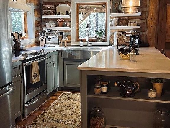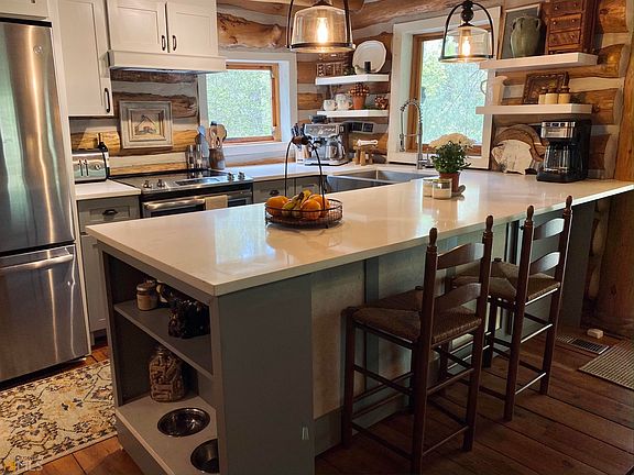 If you're seeking an escape from the hustle and bustle of life, this idyllic log cabin in the woods is what dreams are made of! Meander along a gravel road as you approach this hidden gem. Painstakingly restored, "Finn's Cabin" is a two bedroom, one and one half bath, hand-hewn log cabin that sits on 1.19 acres with views overlooking a private lake/pond. Step inside to a warm and cozy living area that offers a newly renovated, contemporary kitchen complete with stainless steel apron sink and appliances, solid surface counters and new cabinetry. The main living space also offers a masonry wood-burning fireplace, hardwood floors, exposed beam ceilings and a half bath. From the interior living area, step outside and enjoy the large covered front porch overlooking the lake! Make your way upstairs to the owners quarters complete with a second masonry fireplace and renovated bathroom with double vanities, large 2-person tiled shower and a walk-in closet. Follow stairs to the upper loft that is flexible space that can be used as a second bedroom, office or creative space. The property offers manicured yet natural pathways around the cabin that lead through intentional garden areas to the waterfront outdoor fire-pit and small fishing dock. Please note that additional acreage may be available for an additional cost.