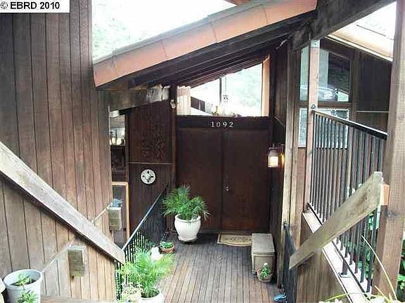 Architect designed contemporary with San Francisco and Bay views. Dramatic living room is filled with light from large clerestory windows. Decks with views off the living room, dining room and every bedroom. Serene and green back yard contains creek bridge and gazebo. Three fireplaces, one in living room and two in bedrooms. 24 solar panels provide all the electricity you need including a car charger in carport.