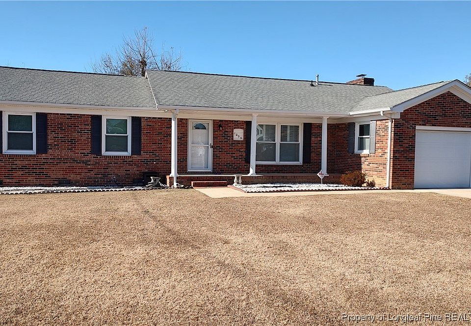Very well maintained 3 bedroom, 2 bath home with a large, fenced backyard and front yard with sprinkler system. Home features massive master bedroom and spacious updated master bath with wheelchair compatible sink. Second full bath is updated as well. Kitchen with granite countertops, dining room, living room, den with fireplace, large utility room with large wall-mounted storage cabinets, garage with opener, washer and dryer, and storage cabinets. Plantation blinds throughout the home. Security system with cameras and voice. Large, covered patio designed for direct vehicle access to the wheelchair widened rear door leading to the master bedroom. All furniture, two refrigerators, TV's, cabinets, and shower seat (all shown in listing photos) remain as gifts but will be removed upon buyer request if desired and donated to a local charity. Located within minutes to Fort Liberty, hospitals, restaurants, schools, supermarkets, fitness centers, etc. Absolutely a gem!