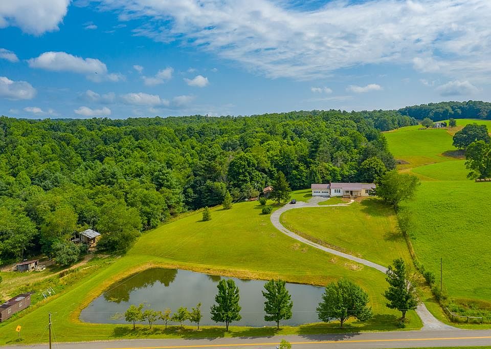 2 BR 2.5 BA home on +/-9.98 beautiful acres in Bland County, VA. 2 car attached garage, 2 ponds, paved driveway, large equipment shed, and outdoor woodturning stove. Interior features include a large master bedroom, potential 3rd bedroom, partial unfinished basement, laminate or wood flooring through much of the home, brick fireplace and wood stove for additional heat sources, and more. New metal roof and two heat pumps for heating and cooling. Home is served by a spring with deeded access. Amazing country views from the covered front porch overlooking the gigantic pond out front and wildlife in your backyard as your neighbors! Located only a little over 4 miles from I-77 in between Bluefield, WV and Wytheville, VA.