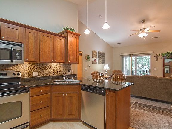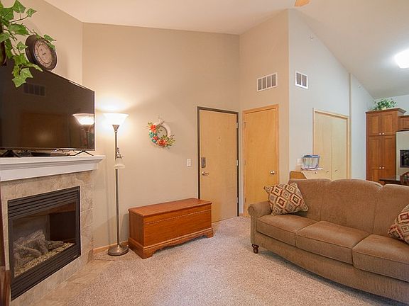 Immaculate 3rd floor condo features vaulted ceilings, fresh paint, granite counter tops, cherry mission style cabinets w/ uppers staggered, breakfast bar, corner gas fireplace & newer carpet. All appliances stay. One of the nicest units in Walnut Towers. One parking spot included in secure parking garage. Two bedroom, two baths. Elevator from garage/front door to unit. Secure Building w/ codes/cameras. Immediate possession! Balcony views of Blue Top Ridge Golf Course! New Efficient AC 2017. MOVE IN READY!
