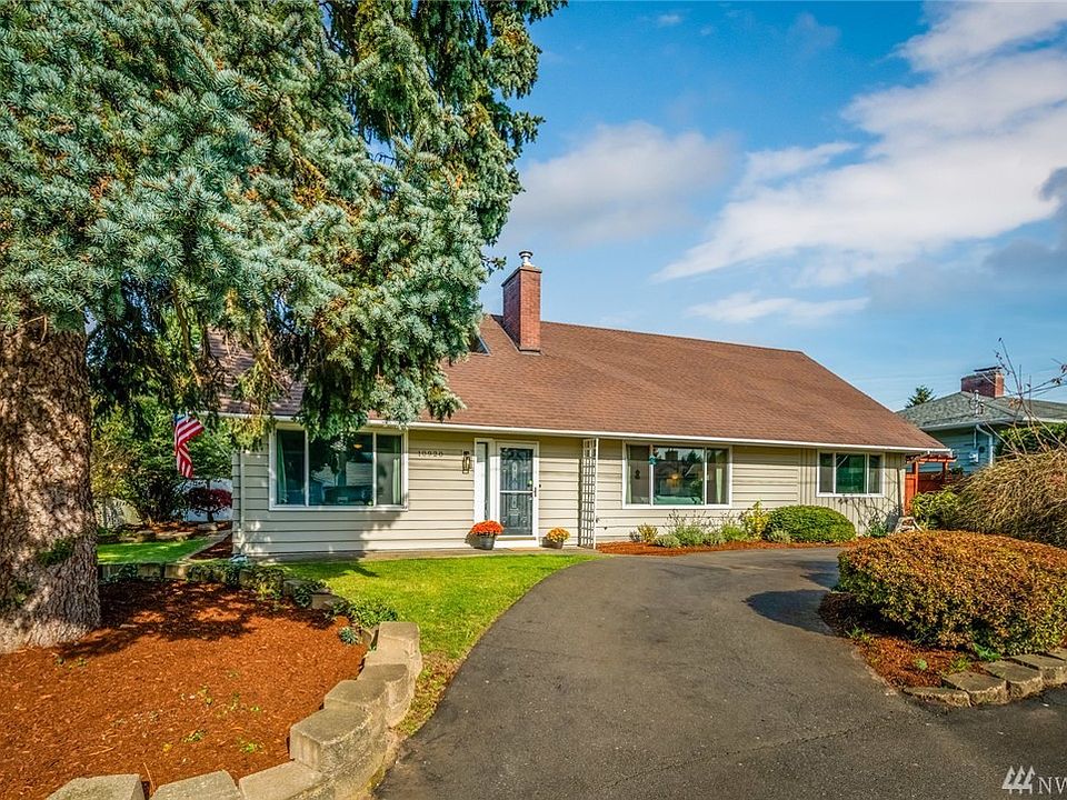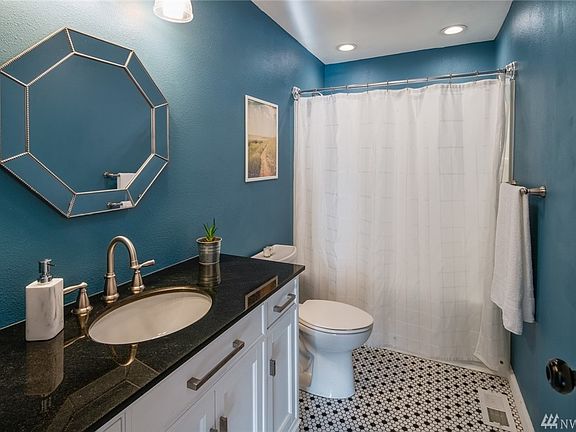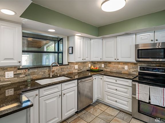 Renton-Benson Hill. Wonderful vintage- MID Century modern feel w/quality remodel top to bottom.Large living room w hardwoods & gas fireplace opens to dining room. New all white kitchen w/slab granite & ss appliances. 2 master suites w attached baths on main level. 2 additional bedrooms upstairs w/1/2 bath.Light and bright large family room across the rear of home w/ access to large level, fenced rear yard, patio & garden shed.New paint in & out.New windows.Gas forced air heat. AWESOME!