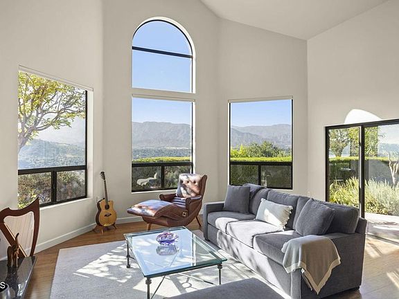 This Mediterranean-style gem, designed by acclaimed architect Marc Whitman, is one of the rare few in the Ojai Valley to offer panoramic views of Lake Casitas and the surrounding mountains. At its heart is a chef's kitchen featuring a Wolf oven, Sub-Zero Pro Series refrigerator and custom alder cabinetry. The living room draws you in with soaring ceilings and expansive glass windows - ideal for soaking in unforgettable sunrises and sunsets.Thoughtfully upgraded throughout, the home includes eco-certified wood flooring, custom alder built-ins and energy-efficient dual-pane windows. Renovations include a new roof and a glass-enclosed Four Seasons sunroom which doubles as a personal gym or wellness retreat. The guest area has its own entrance and complete privacy, is perfect for multigenerational living, visiting friends and family, or as a spacious home office or studio. The three-car garage with tool bench and cabinets offers both ample parking and plenty of storage space. Step outside to 5.6 acres of natural beauty and thriving organic fruit trees - including avocado, orange, tangerine, lemon, lime, grapefruit, pomelo, and more. The property is a haven for wildlife lovers with visits from hummingbirds, great horned owls and red-tailed hawks. An adjoining flat lot with water and electricity is ready for your vision - whether it's a pickleball court or second dwelling. Ideally located just 10 minutes from downtown Ojai and less than 15 minutes from the beach, you'll enjoy cool ocean breezes and easy access to shops, restaurants, and local culture. Meticulously maintained and move-in ready, this exceptional property offers the quintessential Ojai Valley lifestyle - rich in views, nature, and comfort.