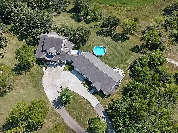 MAGNIFICENT Family Estate! Truly a once in a lifetime property. Gorgeous 24 cleared & wooded acres with so many possibilities! Great for pets, ATV's, hunting, fishing, camping or walking the creek. Outdoor lovers dream! Home sits off 69 Hwy and 247th St. Close to the city + serene privacy in the 2-Story Main home PLUS attached guest home/separate living quarters/pool house/home business/Air B&B. Craftsman style ~ quality built. Beautiful open kitchen looks out over the shaded deck for enjoying the views & sunsets.