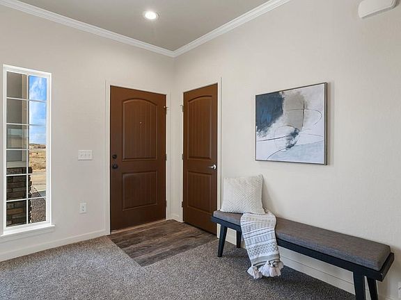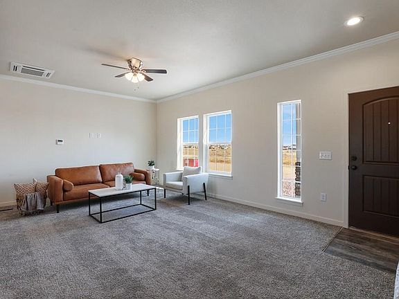 Welcome to this lovely ranch-style home! This home offers a peaceful setting on a 1 acre lot with endless possibilities including unpaved, RV parking. If great outdoor space and a new home with upgraded features throughout is what you're looking for, this home is worth seeing. As you enter the front door, you will find a large living room with crown molding and carpeted floors that is open to the dining area and kitchen. The large living room windows allow plenty of light to pour in to brighten up the main living space. The dining area, which is open to the kitchen, has a walk-out to the backyard and beautiful luxury vinyl flooring throughout. The Kitchen offers so much space with a large center island, stainless steel appliances, warm brown cabinets with quartz countertops, a pantry, and a window over the sink that overlooks the backyard. The master suite is very spacious with a walk-in shower and an adjoining 5 pc master bath with a large soaking tub, an oversized custom tiled shower, and double vanity with quartz countertops. There are 2 additional spacious bedrooms with large closets and a separate full bathroom that also has granite countertops and a beautifully tiled shower. The laundry room is just off of the garage which also serves as a mudroom area. Everything is on the main level with no stairs for ease and convenience. The 3 car attached garage has 2 garage door openers and offers so much additional space. Front yard is xeriscaped to keep your water bill and yardw