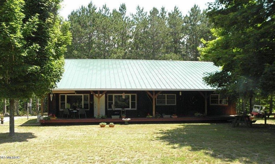 Modern 3 bedroom ranch style home on 23 acre wooded parcel - mostly white pine. Also with meadows and open areas. Spacious "Great" Room floor plan with island kitchen, dining room and living room combined. Attached heated garage (16x60) with doors at each end for convenience and room for the Motor Home. Lots and lots of cabinets for storage. Plus 50x50 Metal Roof. 60 ft long covered front porch to enjoy your beautiful yard area - even a fire pit for family gatherings. Wonderful area for hobby fa rm including horses. Garage could be converted to additional living space.
