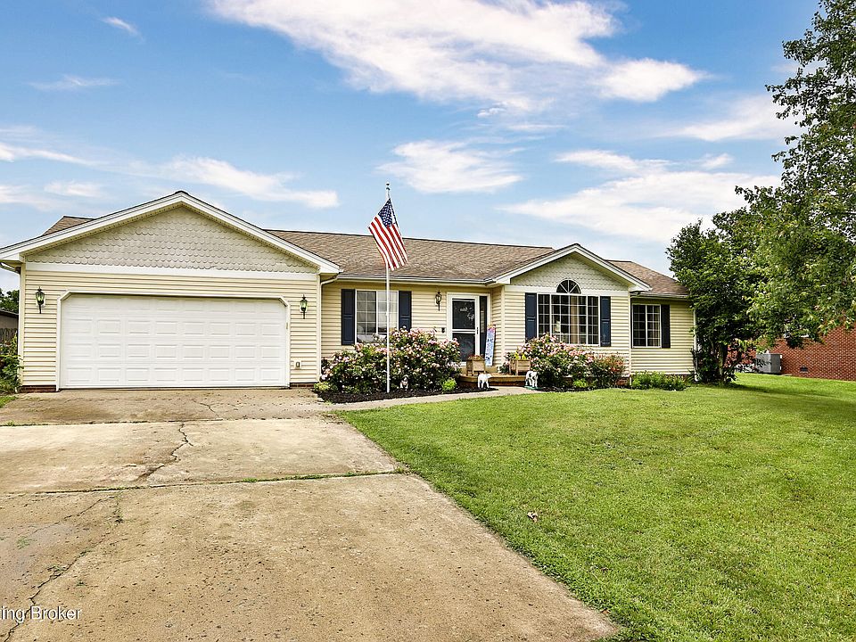Kitchen has hardwood flooring, an ample dining area, and a breakfast bar as well! Split bedroom design has the Primary suite with full bath + walk in closet on one side of the home and two bedrooms and spacious laundry room on the other side. 2 car garage with additional workspace as well. The backyard is its own oasis! The huge lot is flat and fully fenced in. Plenty of room for pets and garden and outdoor play! When you can pry yourself out of your backyard lawn chair, you'll love how close you are to all Lawrenceburg has to offer! Sellers have adored their time here. Their family size continues to grow and they've simply outgrown the space.