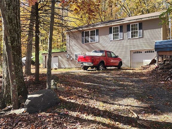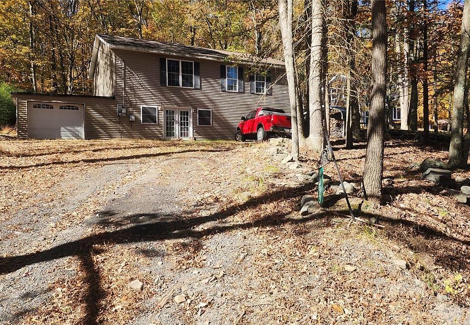 Embrace the tranquility of Bushkill, PA, with this raised ranch, featuring two bedrooms, a full bath, and a spacious eat-in kitchen and living room on the main floor, along with additional space downstairs, including a cozy family room with a bar, a half bath, and two garages perfect for storage or projects. While the home could use a little TLC, it offers a blank slate for customization in the heart of the Poconos. Unlike many nearby communities where short-term rentals are common and neighbors can feel like strangers, the Pine Ridge Community values true connections and fosters a genuine neighborhood spirit. Located near Bushkill Falls, Delaware Water Gap, and popular ski resorts, this property invites year-round outdoor adventures and is ideal as a full-time residence or a personal retreat. Seller is currently working on fixing the septic system, just waiting on weather to improve to start excavating for the permit. Everything else sold as-is, it’s ready for your unique touch.