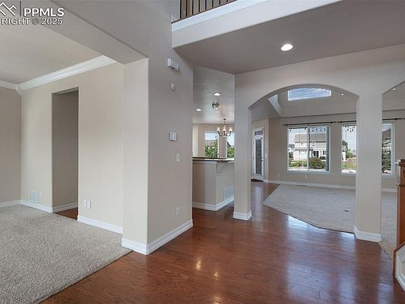 Set in the sought-after Meridian Ranch community, this beautifully maintained home pairs thoughtful upgrades with a spacious, inviting layout. Recent improvements include new roof with warranty, fresh interior and exterior paint, and new kitchen appliances including a refrigerator, microwave, and dishwasher. Two commercial-grade water heaters provide added efficiency and reliability. Inside, the home features a large open floor plan filled with natural light, a grand great room with soaring ceilings, a cozy fireplace, surround sound, and built-ins. The kitchen has a warm and welcoming feel with granite countertops, abundant cabinetry, and generous counter space. You'll find both an everyday dining area and a formal dining room, along with a main-floor bedroom for added flexibility. Upstairs, the oversized primary suite includes direct access to a private deck with sweeping views of Pikes Peak and could function as a separate entrance if needed. Outside, the property is surrounded by custom landscaping with stamped sidewalks, fruit trees, concrete planter boxes, and a matching storage shed. A custom back patio enhances the outdoor living experience and frames the mountain views. Located in a safe, walkable neighborhood with access to an incredible fitness center, both indoor and outdoor pools, a second fitness center currently under construction, a championship golf course, and a clubhouse. Meridian Ranch features its own deep-water wells and is known for its stellar schools. Conveniently close to shopping and dining, just 5–10 minutes away.