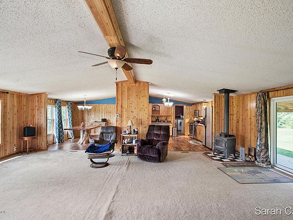 Ranch style Home with 3 Bedrooms and 2.5 Bath on over 12 Acres in a private setting with Black Creek and Hardwood out back. HUGE Great Room with fireplace and wood stove. Kitchen has been updated with big island and plenty of counter and cabinet space. Master Bedroom is oversize with walk-in closet and full bath with soaking tub and shower. 2 additional bedrooms are also nice size. sliders off the dining room area to new deck that is 76' x 8', Arcadia Hardwood floors, New Anderson Windows, new insulation in crawl space, New Heat Pump, New steel Roof, 200 amp service, generator, 500 white pines, all appliances will stay.