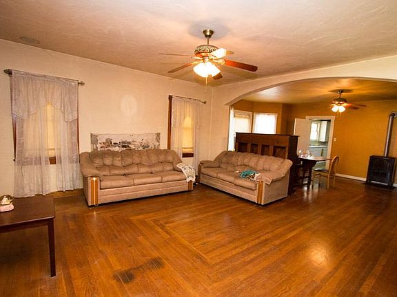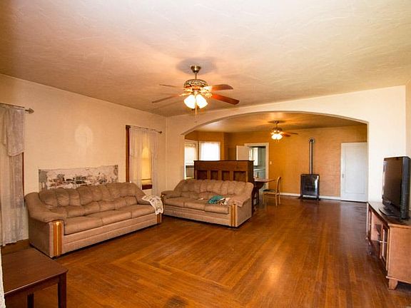Quaint block style bungalow with a lot of potential. Corner lot on 1.6 acres. Interior has charm with hard wood floors, living and dining room, 3 bedrooms and bath with tiled floor and shower. The kitchen has solid counter top and eating nook with storage, Back porch with windows and a step down laundry area. Acerage for animals with fencing.
