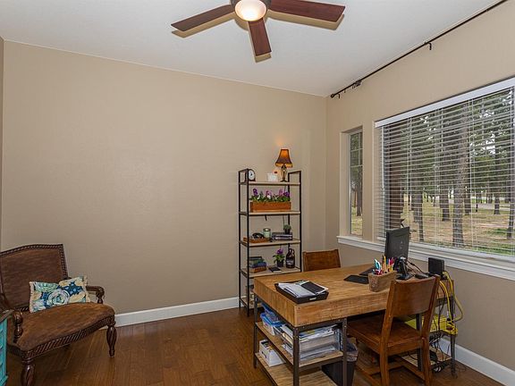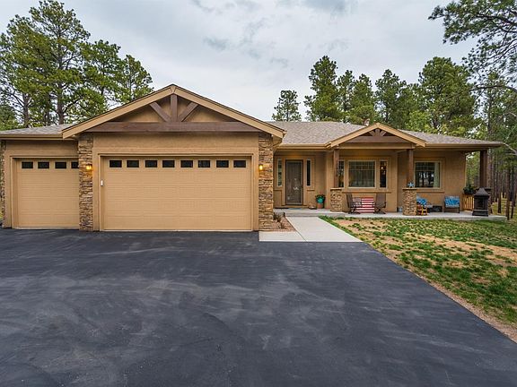 Immaculate 2013 custom ranch style home on over 2 1/2 acres! Private, peaceful and treed. Smell the pines and fresh air in this exclusive gated community. This 5 bedroom, 3 1/2 bath, and 3 car garage home also has Double ovens and a gas range top that will delight any cook. The great room is open and inviting with a gas log fireplace, beautiful wood flooring, and amazing forest views through a wall of windows. The gorgeous curved railing is one of many custom touches you'll enjoy about this home. Spacious and bright master bedroom has attached 5 piece bath with his and her vanity sinks, large tiled shower, separate jetted tub and huge walk in closet. Two more bedrooms, large full bath, and private office complete the expansive main level. Down the curved staircase is an over sized family room, 9' ceilings, 2 more spacious bedrooms, large full bath and over 400 square feet of unfinished storage space. Easy commute to Denver tech Center and DIA.