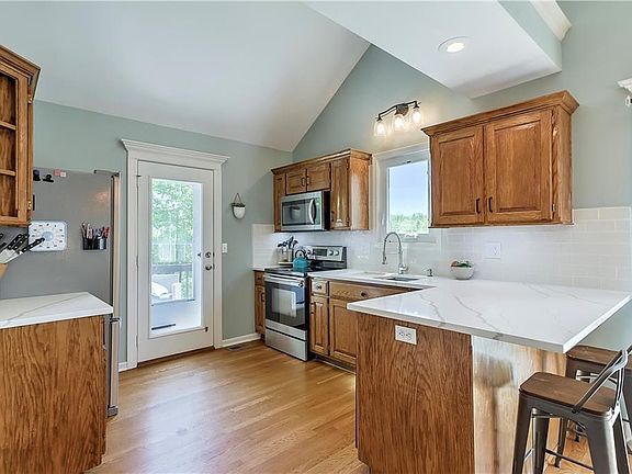 Back on Market at no fault of seller. Inspections done and appraisal complete, buyers backed out just before closing. This home boasts so many positives! Wonderful California split with tons of living space inside and out. The vaulted ceiling and fireplace in the living room invites you in as you wander up to the newly updated kitchen and eating area. 2023 update to kitchen included re-stained cabinets, new tile backsplash, and quartz counter tops. (All appliances in kitchen to remain with home) Door walks out to deck overlooking treed backyard. Backyard adjoins to green space giving a feeling of living on acreage. 2 additional bedrooms and a full bath on the main floor. Ascending to the spacious master suite you find vaulted ceilings and a ceiling fan. The newly updated ensuite includes a new whirlpool tub, new flooring, double vanities, and a generous walk-in closet. The walk-out basement with family room is a wonderfully finished retreat. Great TV space with built-in cabinets and sound system. There is a built-in queen size Murphy bed adjacent to the half bath. Don't miss the bar area with walnut counter top and mini-fridge. Sliding barn door can cover bar area, or slide to cover entry to basement for extra privacy. Down one more level you will find ample storage space, a utility sink, the HVAC system components, and safe, in the sub-basement. The rear exterior has a patio space overlooking backyard. Also some additional exterior, built-in, weather-proof storage under the deck for all your lawn equipment. Other updates include fresh exterior paint 2020, Roof 2020, Newer interior paint and light fixtures, re-stained deck 2024.
