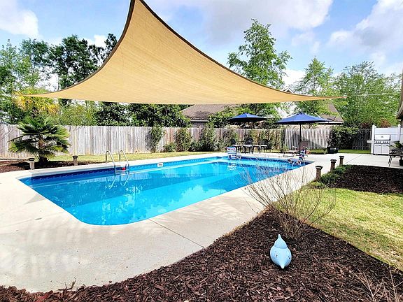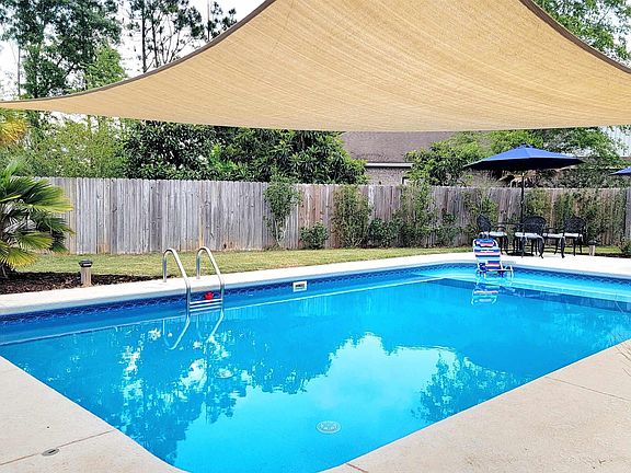 Welcome home to this 3 bedroom, 2 bath private oasis with your very own inground saltwater pool. Step inside to luxury tile floors, cathedral ceilings, quartz countertops, and custom subway tile backsplash. The bedrooms and bathrooms boast 9 foot ceilings. The enormous primary bedroom has a 10 foot trey ceiling with crown molding. The primary bath comes with double vanities, a large soaking tub, separate tile shower, and a walk-in closet. The open living area is expanded by the cathedral ceilings. The quartz countertops in the kitchen provide the workspace you need and additional eating and gathering space at the bar. Soft close cabinetry with the lower cabinets containing sliding drawers and trays as well as ambient lighting provide extra luxury and convenience. Enjoy the screened-in porch which leads to your very own saltwater pool with tanning ledge. The pool is surrounded by a concrete patio with heat resistant technology paint which makes it cool to the touch even on the hottest of days. This all brick home comes with fiber optic internet, a fortified roof, impact windows, hurricane fabric, irrigation system, and motion front door sensor for extra security.