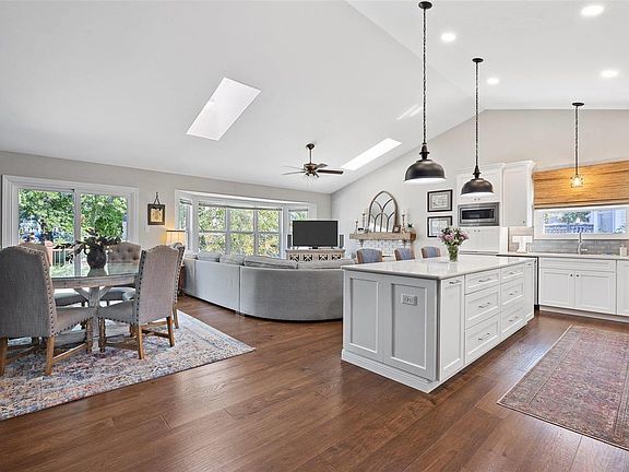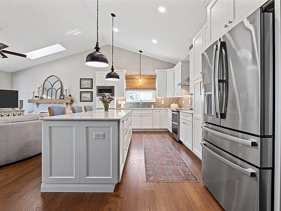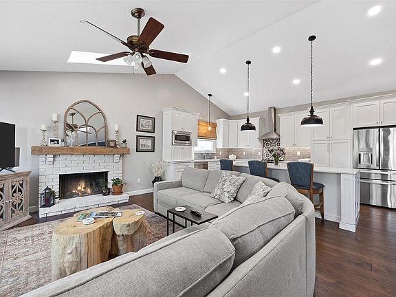 A Chefs kitchen ~ custom cabinets, drawer stacks, trash/recycle cabinet, lazysusan, b-in micro, upscale range hood, appliance garage, pantry cabinet, upscale backsplash & lighting, double oven plus air fryer, Bosch dishwasher & deep sink. The open floor plan allows you to sip coffee at the center island while enjoying conversation with guests in the great room or dining room. The great room is a perfect gathering spot featuring vaulted ceiling, wood burning fireplace, skylights & bay window. Dining/breakfast room overlooks the refinished deck & nice sized fenced yard. Owners suite with barn door entry to updated bath ~ custom tile, tall vanities, rain shower, quartz counter top, sep tub. Engineered wood flooring. Common bath~nice updates. Lower level with family room, full bath, sleeping room, storage & laundry area. Large list of updates attached in MLS - must see!