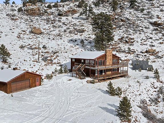 Discover the perfect blend of comfort and nature in this raised ranch home, set on a breathtaking 6.21-acre lot in Florissant, CO. With stunning views of a nearby reservoir and ample space to explore, this property offers a tranquil escape for those seeking privacy and natural beauty. Inside, the home features a spacious primary bedroom on the main level with an ensuite bathroom. The second bedroom is located in the basement, along with the second bathroom, offering a private and versatile space for guests or family. The expansive upper-level living and dining room combination is bathed in natural light, with large windows that frame picturesque vistas. The well-appointed kitchen includes two pantries, offering plenty of storage space for all your culinary needs. The basement also features a cozy family room, a carpeted office, and a dedicated storage/mechanical room, along with a convenient laundry area. This versatile space is perfect for hobbies, relaxation, or working from home. This home boasts a mix of carpet, hardwood, and tile flooring, three cozy fireplaces, and a wrap-around deck where you can enjoy serene views of the reservoir and surrounding wilderness. The oversized detached two-car garage provides plenty of room for vehicles and equipment, while the property’s well ensures a self-sufficient water supply. Set on 6.21 acres, the expansive lot offers endless possibilities for outdoor activities, gardening, or simply soaking in the peaceful ambiance of the area. With a little TLC and updating, this home can be transformed into the mountain oasis of your dreams. Don’t miss this chance to make it your own!