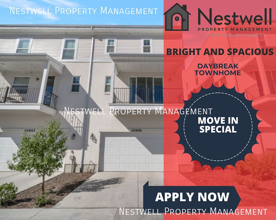 This amazing Daybreak townhome offers plenty of space and comfort, featuring large windows that let in an abundance of natural light, along with automated roller shades in the main living areas for added convenience. The open floor plan seamlessly connects the kitchen, dining room, and living room, creating a perfect space for relaxation or entertaining. You'll also enjoy access to all of Daybreak's incredible amenities. Schedule your Showing Appt. ONLINE NOW! * 50% Off First-Month's Rent* Promotion: If you sign a lease for a Nestwell Managed rental this month, your application fees will be refunded. Showing times don't work? AVAILABLE DATE: NOW! LEASE LENGTH: Lease ending longer term of Spring of 2027 OCCUPANCY RULE: No More than 4 unrelated adult occupants TYPE: Townhome TOTAL SQ FEET: 2178 GARAGE: 2 Car Garage FENCED YARD: No Yard FEATURES: - 4 Bedrooms - 3.5 Bathrooms - Upgraded Countertops - Island Kitchen - Stainless Steel Appliances - Family Room - Walk-In Closet - Double Vanity - Separate Tub & Shower - Washer/Dryer Included - Cold Storage - Balcony - Google Control Surface Center - Nest Thermostat - Smart Cameras - New Paint - New Carpet - And more... TENANT CHARGES: - Resident to sign/pay for gas & electricity - Resident to pay for water & garbage monthly - Resident to pay $33.00 for Sewer Monthly - Resident to pay $143.50 HOA Fee per month - Resident Benefits Package (RBP) = $34.95 per month *For information on this service - Property Damage Liability Waiver For Residents (PDLW) = $15.95 per month.**For - Security Deposit = Same as rent depending on application score (fully refundable) - Application Fee = $40.00 per applicant 18 and older - Lease Initiation Fee = $150.00 after approval and upon signing - Pet fees as listed (if applicable) - If the mailbox is a community box that requires a key, it is owned by the Postal Service. A small fee may be required to get mailbox keys upon move-in. *Washer & Dryer provided as a courtesy, owner may choose not to repair them HOA INCLUDES: - Fitness center & clubhouse - Pools & playgrounds - Trails & bike paths - Lake access, boats, kayaks, etc. YARD CARE: Maintenance Free Community! PETS: - $479.00 per pet security deposit ($239.50 AMOUNT refundable) & $55.00 pet rent per pet. - You will be required to fill out an animal profile and will be provided the link after you have submitted your application and paid the fee. - No resident or residents at any one premises shall at any one time own, harbor, or license more than ONE total animal in any combination - ONE PET will be considered if they meet our pet guidelines.- The pet application fee is $30 for the first pet, $30 for each additional pet, and $0 for assistance animal accommodation requests. - For puppies & kittens less than 12 months old, there is a non-refundable fee of $100 and a monthly charge of $10/month until the pet reaches 12 months of age in addition to the regular fees. NO Smoking or Vaping is permitted in or on the property. SHOWING INSTRUCTIONS: TO APPLY: - $40.00 application fee per adult to be paid at the time of application. - All applicants will be required to fill out an animal profile even if you do not have a pet. The link will be provided after you have submitted your application and paid the fee. - We process all applications, and the first application that completes all the paperwork requirements will be processed first. PROPERTY MANAGER: CDA/Nestwell Property Mgmt. 8813 S Redwood Road #D1 West Jordan, UT 84088 * All information is deemed reliable but not guaranteed and is subject to change. Animals (Friendly) Bangerter Highway Access Clubhouse/Fitness Center Cold Storage Cooling (Central Air) Countertops (Granite/Quartz) Disposal Double Vanity Floors (Carpet) Floors (Laminate/Lvp) Floors (Tile) Garage (2 Car) Gas Stove Hoa Community I 15 Access I 215 Access Island Kitchen Mountain View Corridor Access New Flooring New Paint New Property ( 5 Years) Pool Separate Tub & Shower Sprinklers (Auto) Trax Station Access Views Washer/Dryer In Unit