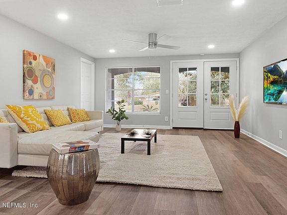 Stunning fully renovated home on a beautiful treed yard! Step into a world of warmth and comfort as you enter the open-concept living space, perfect for creating lasting memories with loved ones. Open and airy layout with a timeless, gourmet kitchen which showcases white shaker cabinets with granite counters, designers tile backsplash and stainless steel appliances. Luxury vinyl waterproofed flooring throughout. Designer bathrooms with porcelain tiles and mosaic designs. Oversized laundry room with plenty of storage. Home features a flex room which can be used as a fourth bedroom, office or entertainment room. NEW PERMITTED ROOF! Close to shopping, dining, parks and schools, also an easy drive to Jacksonville International Airport, and to downtown Jacksonville.