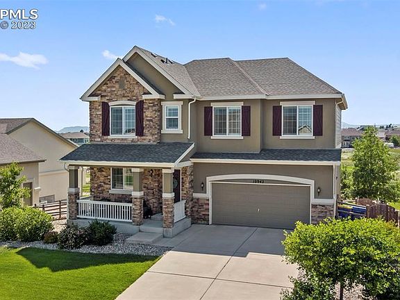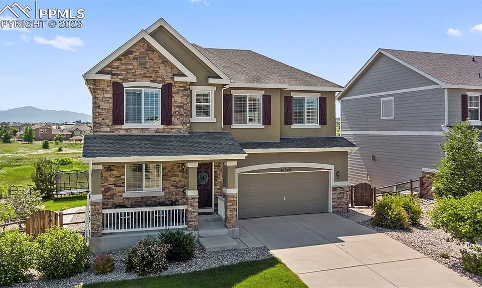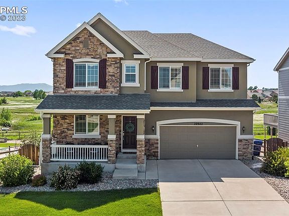 Welcome to this incredible home nestled on a quiet cul-de-sac with breathtaking views of Pikes Peak and the front range! Step inside to discover a charming kitchen featuring granite counters, an adorable pantry with ship lap and custom wood shelves, a convenient breakfast bar with charging ports, and a composite sink. Enjoy Pikes Peak views from the kitchen sink! The dining area leads to an expanded composite deck with outdoor speakers, a corner pergola, and panoramic views - perfect for outdoor gatherings and soaking up the scenery. The backyard oasis offers privacy and tranquility with its water feature and large yard. The spacious family room welcomes gatherings with its cozy fireplace. Working from home is a breeze in the large office, complete with French doors and custom piped shelving that doubles as a stylish video conference background. A half bath is conveniently located on the main level. Upstairs, an impressive loft awaits, a great space for movie nights and capturing the stunning views. The three large secondary bedrooms provide space for family and guests, and are serviced by a full bath down the hall. The expansive primary retreat offers more breathtaking views, a coffered ceiling, an upgraded fan, and a spa-like ensuite with granite counters, dual sinks, a separate shower and tub, and a generously sized walk-in closet. Completing the upper level is a laundry room that will make your laundry routine a pleasure with its ship lap walls, butcher block counters, full wall cabinets, and upgraded sink. Plantation shutters throughout. The unfinished basement presents an opportunity for future expansion, with its own set of magnificent views. The garage features epoxy floors and an extended area. The home is equipped with a CAT 6 network system, indoor/outdoor speakers, wired wifi throughout, electric car charger and TV mounts included. Enjoy the Meridian Ranch lifestyle with pools, parks and golf course!