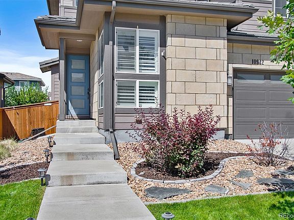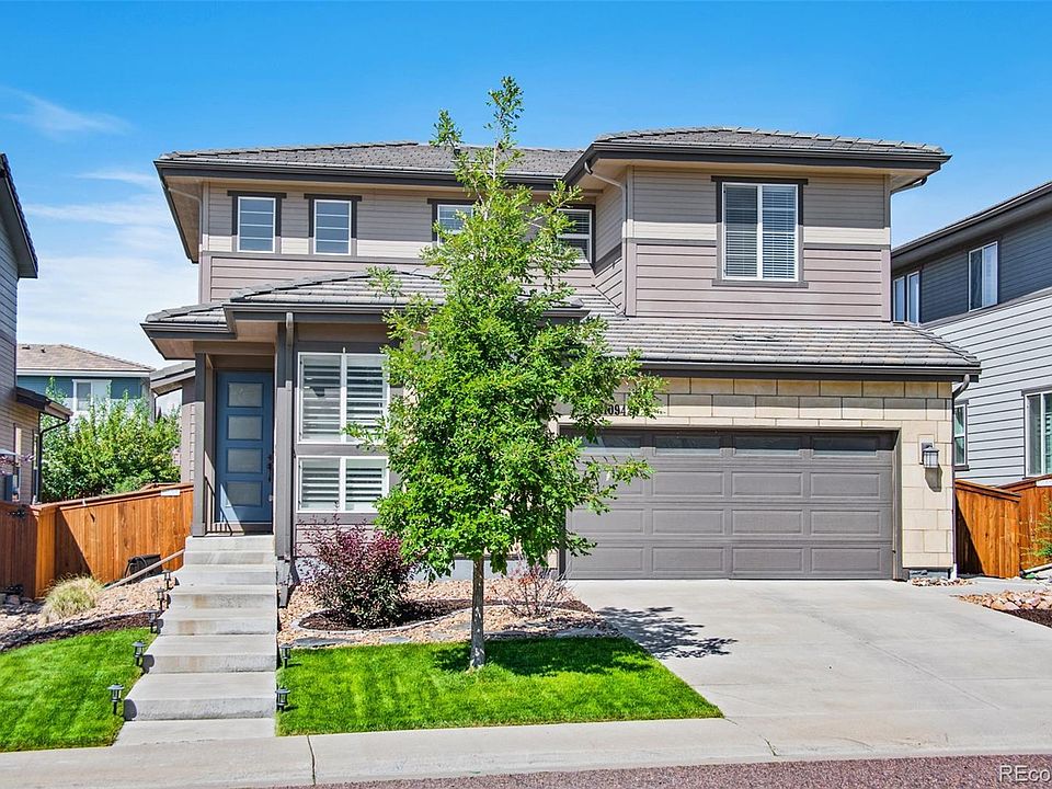 Highly desirable Stepping Stone community! Beautiful home featuring $90K in upgrades! Boasting extensive Carrera tile floors in the foyer, great room, kitchen. Additional upgrades include a chef’s kitchen complete with 42 inch cabinetry with dovetail soft close drawers & cabinets, slab granite counters, glass backsplash, SS appliances, large pantry and a spacious breakfast room overlooking the extended shaded covered backyard patio! Enjoy the main floor study or non-conforming 4th bedroom. Luxurious primary suite with upgraded bath cabinets, slab, double showerhead, large walk-in closet. Two secondary bedrooms, upgraded baths and laundry. Fully fenced yard with sidewalk access to the front. Plantation shutters or custom blinds throughout top off the stunning home! Washer, dryer, bbq grill, 2 wall mounted tv’s included! Very close, 3 miles, to light rail Ridgegate station, easy walk to clubhouse, neighborhood private swimming pool, trails & 4 community parks. Food Truck Friday at the pool! Neighborhood special events, Stepping Stone 5K, dog splash, Walking distance to the east west trail and Reuter Hess incline and trails.