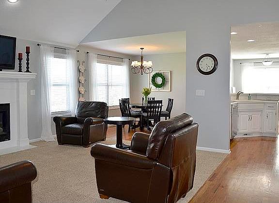 Beautiful reverse ranch with great open floor plan! New subway tile back splash in 2016. Hardwood floors, Master suite with whirlpool tub and his and hers sinks. Laundry on main level. 3 Bedrooms upstairs and 2 down stairs. Covered deck and walk out basement. All new landscaping in 2016. Lot backs up to beautiful green space with no back door neighbors.Basement has separate living area, full bath and plenty of storage. Workroom on lower level has built-in workbench and separate entry for ease of lawn care.