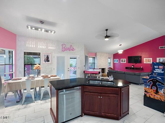 Enjoy a furnished bright and playful interior with modern finishes and a unique design flair that includes fun pink accents and curated details throughout. The spacious open layout flows seamlessly from the living room to the dining area and into the kitchen featuring stainless steel appliances, quartz countertops, and a breakfast bar.