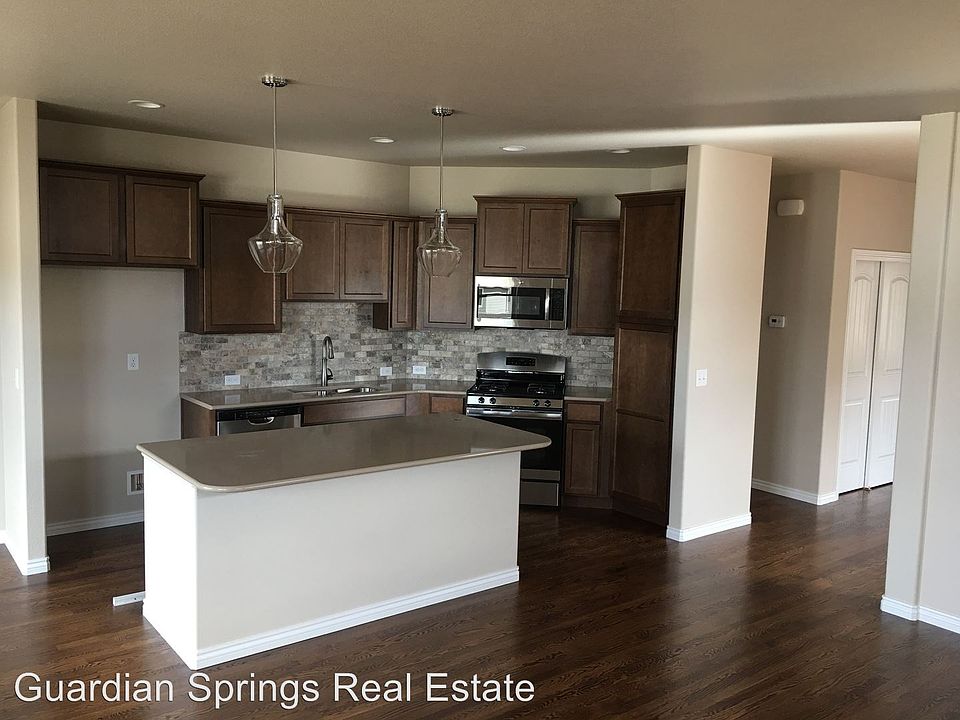 Brand New D20 Home 4bd 3ba Walkout and Main Level Master - This is a rare opportunity to rent a brand new home that has never been lived in and in an excellent location. Construction on this home was recently completed. The home features a main level master as well as a second bedroom and full bathroom on the main level. Mostly wood floors on the main level with a great open concept. Elevated deck off the casual dining and kitchen area. Large island in the kitchen which features stainless steel appliances. The basement is fully finished and offers 2 more bedrooms, a full bath, walkout, and an enormous family room. Front yard will be xeriscaped, back yard will have brand new sod. Being a brand new home, this property offers clean, modern, convenience, efficiency and a rare opportunity. One small dog may be considered based on breed and age. This home is walking distance to Pine Creek High School and offers easy commutes with quick access to Powers or I-25. For more information or to apply visit www.GuardianSprings.com No Cats Allowed (RLNE2673247)