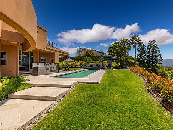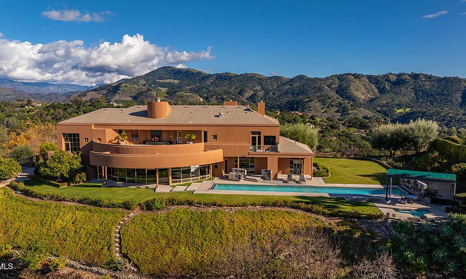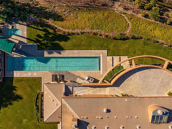 This contemporary architecturalmarvel is perched upon a hill with sweeping views of Lake Casitas and all of the mountainsthat ring the Ojai Valley. The 6br/6ba, 7600sqftvilla was built to the highest luxury standards and appointed with taste and elegance. It is offered as a complete package, including all furniture, a fully equipped kitchen, artworkand luxury linens. With modern lines and circular accents, the design maximizes the feeling of space and light with high ceilings and massive windows. The main living room has a semi-circular glass wall that offers an awesome 180 degree view, above which is a 2000 sqft verandawith a fireplace that opens to the sky and creates a commanding perch from which to observe the vast valley below. The living spacesare built to take advantage the incredible vantage point with strategically placed windows,each offering a unique perspective onthe sweeping vistas. The main entrance introduces the house with a unique circular wall opening that reveals an inside garden, a Tokonoma, and a two story central area that leads to the different parts of the house. The main living room blends curves and angles to create an elegant gathering space, with ample seating, a large fireplace, textured limestone floors, stone accents and automatic shades for the glass wall. The open kitchen/dining room complex includes a dining table with lake views, a fireplace, a breakfast area for morning sun and two built in desks. It is appointed with ultra - high end appliances, modern lighting and custom hardwood cabinetry. The spacious primary suite includes a fireplace sitting area, Topa Topa views, and a spa - like granite bathroom with a private porch overlooking the lake. There is a well - appointed gym, a circular 3rd floor sitting room with perfect views of the Topa Topas, and a media room with an extra- large projection screen. The house is filled with high end AV equipment for audiophile sound, automatic shades and artistic lighting. The grounds include impeccable landscaping. The pool, spa and outdoor dining area are completely private and offer sun, shade, sky and unrivaled views. An organic family orchard produces a variety of fruits. The unparalleled design, quality and sheer beauty of this house integrate the natural splendor of its surroundings. This property represents high concept design, exquisite craftsmanship, & the finest natural materials in a complete turnkey package ready to occupy immediately.