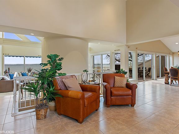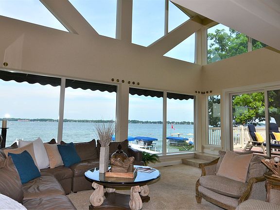 Welcome to Pier 534 on Beautiful Lake Wawasee. This contemporary home is ahead of it's time in design. A custom built open concept home unique in every way. The Home features over 80ft of prime Lake Wawasee Shoreline. Sandy bottom and gradual depth for the perfect swimming spot! As you approach this home, you walk thru the private courtyard and paver sidewalk to the front door. The dramatic foyer invites you inside the serene atmosphere inside. The foyer is filled with natural light and impressive architectural details. Exposed beams accent the vaulted ceilings and the lake tugs at your senses as you enter the great room which is lined with a wall of windows. A fireplace in the center and panoramic lake views makes this room a favorite spot for you and guests to enjoy. The Chef's Kitchen has everything you need for entertaining; oversized island with sink and electric cook top, granite countertops, custom cabinetry and much more. The dining space overlooks the lake and has vaulted ceilings as well. The low maintenance deck with gas grill and patio furniture is ready for summer cookouts. There is a canopy that expands over some of the deck area to provide shade on a sunny day. On the other side of the foyer is the master bedroom suite, a tranquil spot to relax after a hard day of playing on the lake. The private balcony,off the master suite,provides another panoramic view of this fantastic lake. The dressing room and master closet are fit for a queen as is the bathroom with the walk-in shower, solar tubes for natural sunlight, a jetted tub and double vanities. 3 more bedrooms/suites complete the main level- one with it's own bathroom and 2 bedrooms share a Jack and Jill bathroom. Built ins, sitting areas and private space found in each bedroom. The unique staircase has stone framing the exterior of it for an artistic and earthy feel to this space. There is a game room-bar area with another entrance to decking & patio and a full bathroom for guests. This game room could serve as another bedroom suite if needed. There is office space on the back side of the staircase as well as a family/kid's room that would be ideal for movie night. Another bedroom-exercise room (has no egress window or closet) and another full bathroom are off this wing of the home. A 2 car garage and a lot across the street top off this fantastic home. The Lake frontage of this home & prime location on Ideal Beach make this a very sought after property.