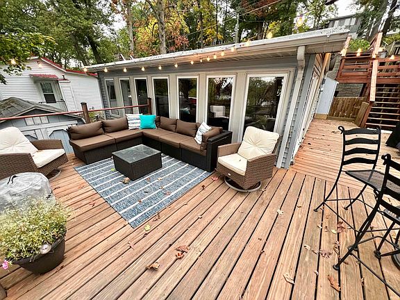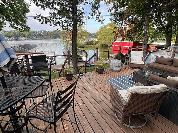 Shaded yardDining spaceDeck spaceLake-level water frontageWasher and dryerWhite cabinet kitchenGrilling or smoking activities