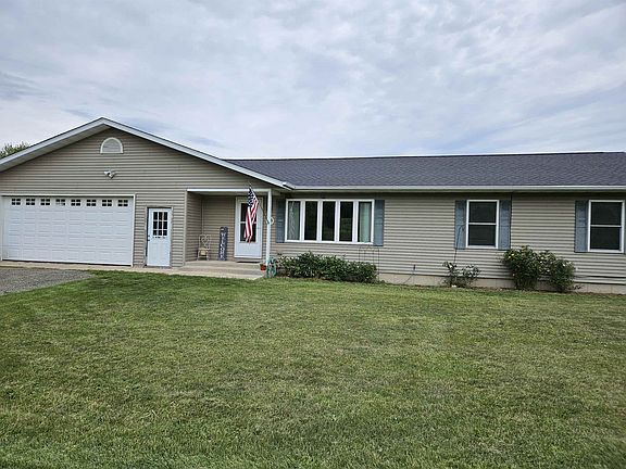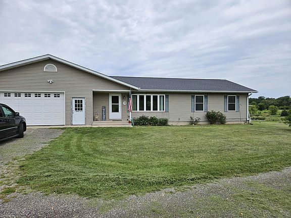 BRING THE FISHING POLES to enjoy the day at the fully stocked pond on this secluded 5.30 acre one-owner property! This ranch-style home is one level living but does have a full basement with a good-sized partially finished room! The home has lots of extra insulation for low utility bills. The main floor has a first floor laundry room, 3 bedrooms, 1 full/1 half bath, large living room and a huge eat-in kitchen. There is a patio door off the kitchen out to a large deck that overlooks the land and the huge pond that is stocked with trout, bass, crappie, blue gill, perch and many other kinds of fish. The pond was dug and stocked by the original owner, there is a creek that feeds into and out of the pond... and all the area kids love to spend their days there fishing! There is a 2 car extra deep attached garage as well as a 3 car detached garage further back on the property. No FHA/VA financing due to peeling paint on the deck and exterior door trims, that is being worked on. The roof is about 6 years old, there is a water filtration system, well tank, garage door springs and sump pump all new within the last year! The home needs a little TLC but is a great opportunity, don't miss out! Property is being sold As-Is.