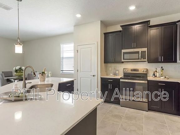 Nestled in a tranquil setting, this charming one-story home offers a spacious and open floor plan with four bedrooms and two bathrooms. The heart of the home is the kitchen, which flows seamlessly into a generous family and dining area. With its beautiful espresso cabinetry, modern appliances, granite countertops, and a convenient pantry, the kitchen is perfect for both everyday living and entertaining. The master suite provides a peaceful retreat, featuring an oversized bathroom with his and her sinks, elegant granite countertops, and a large shower. The double walk-in closet offers ample space for all your storage needs. Step outside to enjoy a serene, covered rear patio, where you can take in the scenic views of the surrounding forest and pond. Additional highlights include a well-appointed laundry room and a two-car garage. This home combines thoughtful design, modern amenities, and a peaceful atmosphere, making it a truly wonderful place to call home. Tenants will have access to the Oasis Resort Amenities for free and for an additional fee the Champions Gate Country Club. Washer and Dryer Included. Some of the photos may be staged with furniture that is not included. Call today for a convenient showing.