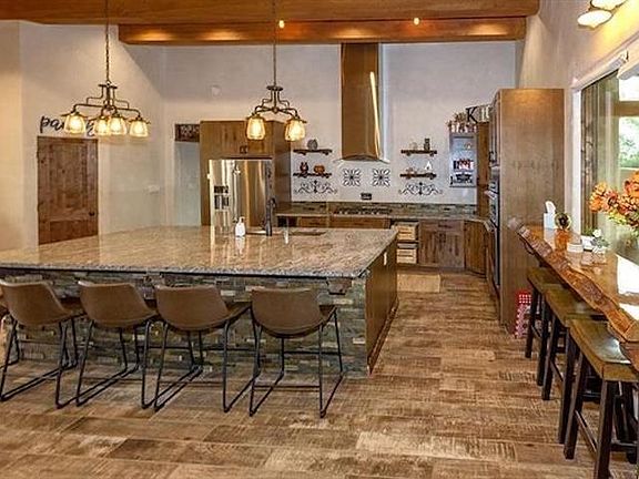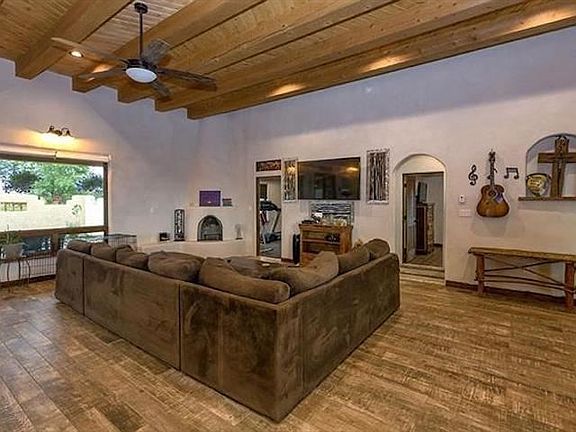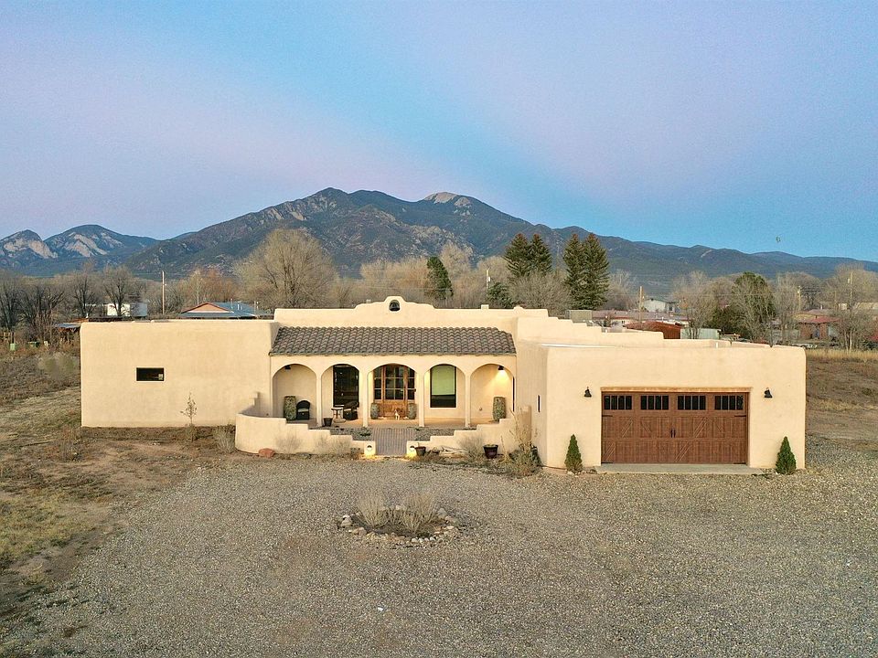 Immaculate with El Prado Views...This beautiful contemporary Southwestern style home built in 2019 is in impeccable condition for the next owner. This 3 bedroom/2bath house with a heated two-car garage is situated on a private dead-end road just minutes away from the Taos Plaza with Acequia water rights and boasts expansive views of the mountains, valley, and western sunset. The living room, dining room, and kitchen are designed with an open and functional floor plan with 15ft high herringbone t&g beamed ceilings allowing for easy flow and a relaxed lifestyle surrounded by plenty of sunlight. The kitchen has gorgeous knotty hickory cabinets, top-tier granite countertops, a giant island with prep sink, stainless steel Kitchen Aid appliances, including a chef's range and beverage cooler, and plenty of space to cook daily or for Holiday meals. The breakfast bar is ideal for morning coffee or evening tea watching the birds & pets enjoy the backyard while staying warm with natural heat from the kiva fireplace. The spacious master bedroom hosts a lounge area, wet bar, giant shower, and walk-in closet, and direct access through breathtaking 12 foot wide patio doors to a private patio with hot tub where summers allow for the perfect indoor/outdoor living space. The second wing of the home has two bedrooms with ample storage, a separate bathroom, a workout room, and an oversized laundry room that can be utilized as an art studio. You will enjoy the extra-large custom doors throughout the home, Live Edge sills and floor trim accent on every window in the home inspired by the local Taos mountains, and the lovely stained glass windows above the hall archways. The current owners have taken great care of the outdoor spaces and the gardens/xeriscape that stay hydrated with water from the local acequia and drip irrigation system. The covered backyard portal provides generous space for outdoor living, playing, and entertaining; or increase the size of your yard with the additional acreage being offered with this listing. Fiber optic has been installed for reliable WIFI and fast streaming. This home features a state of the art on demand hot water system, radiant floor heating, along with back-up forced air heat and bonus refrigerated air conditioning. Come take a first-hand look at this immaculate El Prado property!