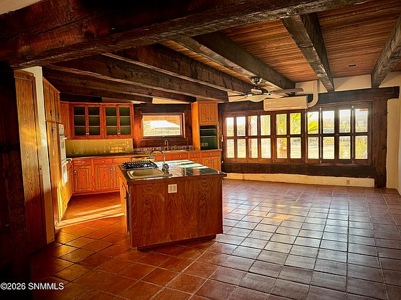 This Southwestern property, situated on 7.679 acres, features a traditional adobe main house with vigas, rough-sawn cedar, and wood bond beams, all centered around a living room with a stone fireplace and wood floors. The spacious kitchen includes double ovens, an island, tile countertops, and Saltillo tile flooring. The home offers three bedrooms, two full baths, mixed wood and tile flooring, a generous front entry, and a rear sunroom. Wrapping around the home is an inviting outdoor porch, perfect for relaxing year-round while enjoying the views and peaceful surroundings.A 975-square-foot adobe casita adds a living room with a kiva fireplace, a combined kitchen-bedroom area, one bath, and a cedar closet. The grounds also feature a separate, powered workshop, bird enclosures, livestock pastures with pipe fencing, and ample outdoor spaces for all your activities.