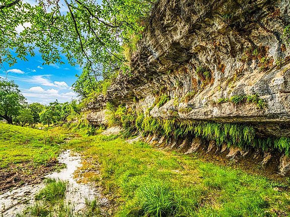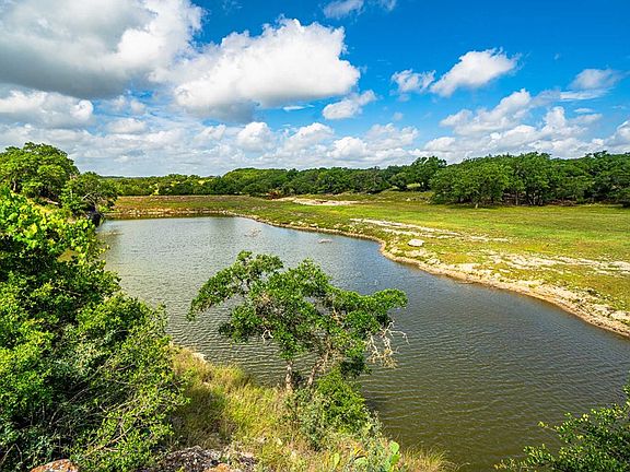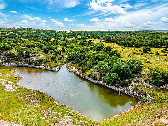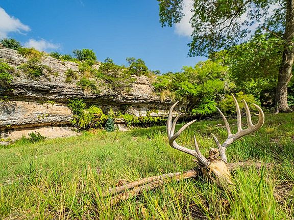 An absolutely gorgeous ranch with stunning live water. The rock bottom creek that runs through the middle of the ranch has been dammed up three times. Two smaller concrete dams, and one large earthen dam that backs up a beautiful and deep 1+ acre lake that is great for fishing and swimming. On the south bank of the lake is a dramatic limestone bluff that gives the lake tons of character. Upstream from the lake there is a limestone cliff that has been cut into the side of a hill by the meandering creek. This cliff is covered in lush ferns, and seeping springs. Upon seeing it, you can almost envision the Native Americans that almost certainly camped in its shade. The ranch offers a rolling terrain that provides stunning views, nice native grasses, and large hardwood trees. The property is high fenced and boasts of large trophy white-tail. The nice 3 bedroom 2 bathroom house is the perfect weekender. It offers a large open living area with high wood ceilings, and a nice kitchen with. The house has stained concrete and vinyl floors, making them easy to maintain. There is an attached 2 car carport with lots of storage space. Perfect for hunting, livestock, horses, or to just get away.