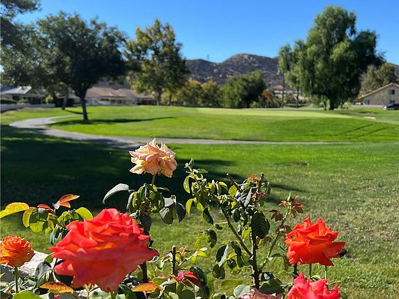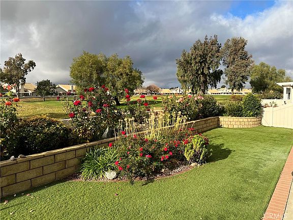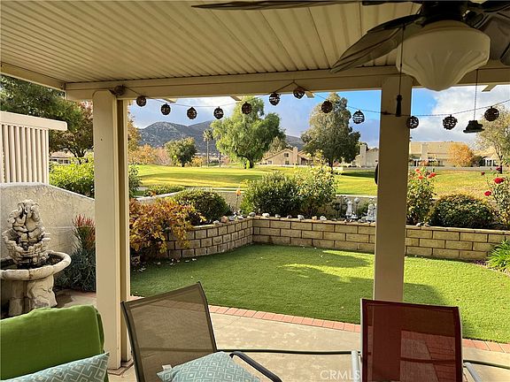 Must see, Beautiful upgraded single-story home on the golf course! This Tivoli Model home has ample dual paned windows, skylights and recessed lighting! Crown molding, the Hunter Douglas window treatments. laminate wood flooring /carpet in living room. Den has built in desk and book shelve. The kitchen has been upgraded with granite counter tops. Professionally landscaped with artificial turf in the front and back yards, view of No.3 green and fairway. Aluma wood patio cover with ceiling fan for relaxing outside. The custom cabinets in the garage, attic space and epoxy flooring. Don't miss out on this great opportunity! 55+ Community.