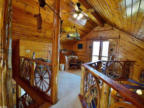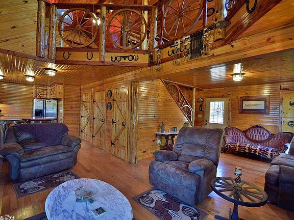 Come home and hang up your hat in this western home sitting on a beautiful 5 acres. Great for the weekender or full time resident. Lovely space with finished wood throughout. The bedroom loft and office overlooks living room. Master Bedroom is located convenient on the ground floor. This unique home would be a perfect weekend getaway. 14 minutes to Cove Creek on Greers Ferry Lake or 30 minutes to the Chuckwagon Races or 45 Min. to conway. . Bring your boat, your horses or your hunting equipment.
