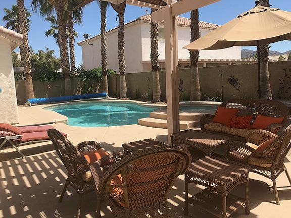 Location+Turnkey=RARE! One Story, 3 Bed, 3 Bath, 3 Car Garage home in the heart of Henderson. This open plan has vaulted ceilings w/ two tone paint and upgraded tile and laminate everywhere. Custom chefs kitchen with stainless steel appliances, granite counters and gorgeous glass backsplash. Master bedroom separate from other two bedrooms. Walk-in closest w/separate shower and tub. Backyard oasis w/ crystal blue pool, hot tub w/covered patio! WOW