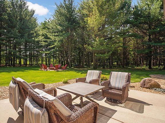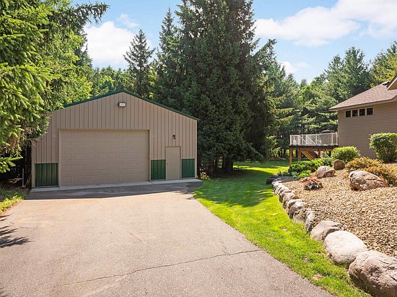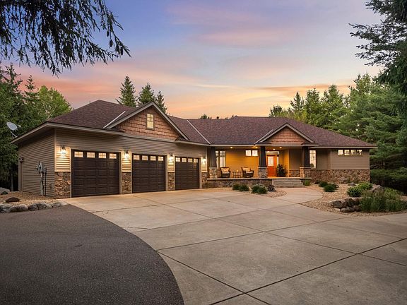 Welcome to your private retreat on 2.5 landscaped acres in Elk River. Located at the end of a quiet cul-de-sac and surrounded by mature pines, this custom-built rambler offers the perfect blend of privacy and thoughtful design. Inside, you'll find vaulted ceilings, oak floors, solid-core doors, and a spacious kitchen with maple cabinetry, granite counters, center island, and stainless appliances. The living room features a gas fireplace, floor to ceiling windows, and built-in speakers, while the dining area opens to composite decking (2021) and a private backyard with no rear neighbors. The heated tile mudroom includes built-in lockers, walk-in closet, sink, and half bath. The main-floor primary suite offers tray ceilings, a jetted tub, walk-in tile shower, dual sinks, and a large walk-in closet. French doors open to a second, main floor bedroom or office. The finished walkout lower level includes in-floor heat, a stone fireplace, full wet bar, two bedrooms with en suite baths, a flex room, and plenty of storage. Exterior upgrades include a concrete patio, paver patio with fireplace, sprinkler system, and outdoor speakers. Bonus features: 3-car heated garage with epoxy floors (2021), 49x30 pole barn (2017), electrical shed, new roof (2022), furnace & AC (2021), foam insulation, and updated high efficiency appliances. With every detail thoughtfully maintained, this home offers the space, privacy, and function you’ve been looking for.