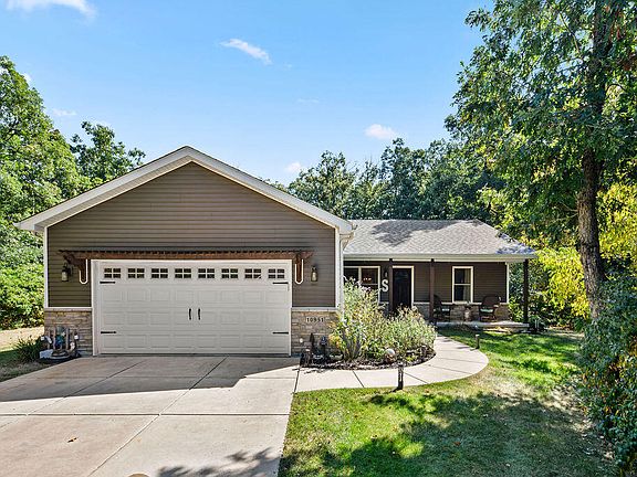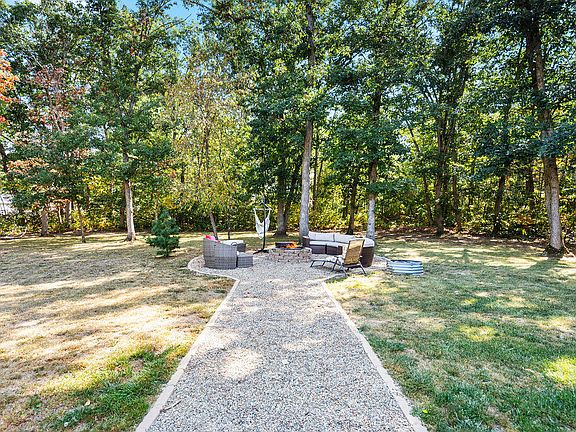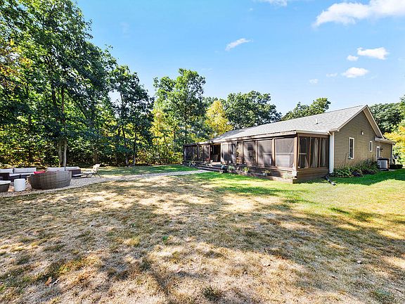Open concept modern farmhouse RANCH on tree lined private acre lot. Dream home built in 2017 includes a huge screened in porch complete with hot tub and views of woods surrounding the home. Privacy and luxury combined make this a perfect lifestyle! Stunning gourmet kitchen includes GRANITE custom counter tops, soft close cabinets and drawers.stainless steel appliances including microwave drawer, apron farmhouse sink, and pendant lighting over bar area. Open concept great room finished in hardwood flooring throughout. Walk in closet in 2 bedrooms and primary bedroom has a closet organizer. Custom detailed bathrooms with upgraded sinks, tubs and cabinetry. Large finished laundry room with built in cabinets; washer and dryer included. Private backyard complete with fire pit, entertaining area and utility shed. Upgrades include concrete driveway for durability and easy maintenance.Eyebrow above insulated garage. Front porch has wood beams. Landscaping completes the entire yard.