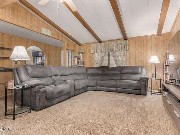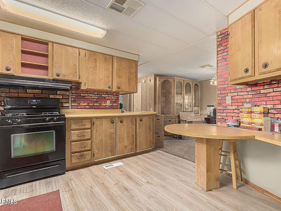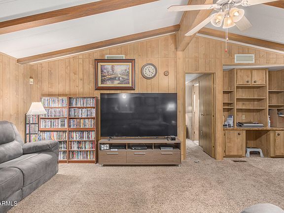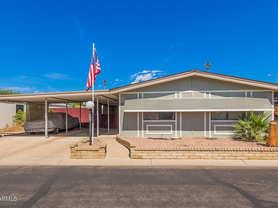 This 3 bed 2 bath beauty has vaulted ceilings, built in hutch and a built in desk, newer laminate flooring in kitchen, newer carpet throughout. Tons of storage! Inside walk-in laundry room, 2 storage units. Newer exterior paint. Newer paint in master bath. Large covered double carport and large fenced yard with covered patio for privacy. Peoria Polynesian Village is an all-age community, common areas feature an inviting clubhouse, a sparkling swimming pool, a great laundry facility, a fitness center, an RV storage area, and much more.