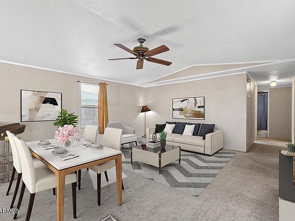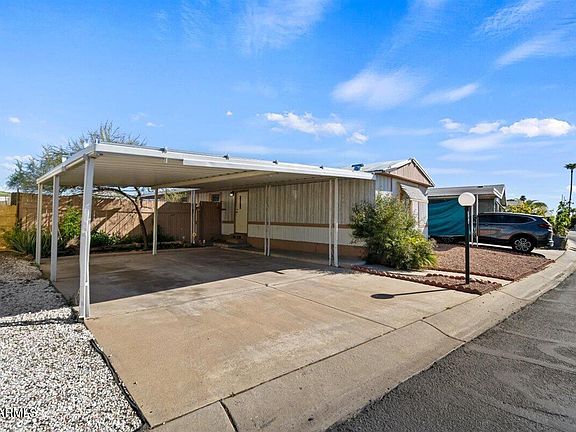 Check out this recently updated 4 bedroom, 2 bathroom manufactured home with kitchen updates in 2023 including flooring, cabinets and countertop. Seller is only offering home, car port and two storage sheds as it is located on leased land and you will need to pay a monthly lease fee to Polynesian village plus utilities and annual tax on the home. Located in the heart of Peoria, AZ, the Polynesian Village is conveniently located near a variety of shopping, dining and entertainment options. It is also close to several major highways, making it easy to commute to other parts of the Phoenix metro area. This home is located in a mix of single family homes where the landscaping is maintained and it includes a community pool and playground. Proof of funds/financing must accompany offer