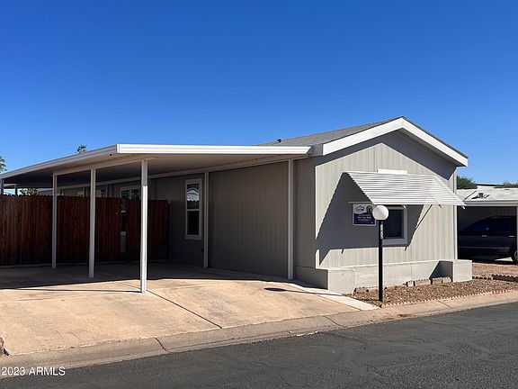 This is leased land. This mobile home is located in a quiet and family-friendly all-ages park in Peoria, AZ. The park is close to shopping, restaurants, and medical facilities.