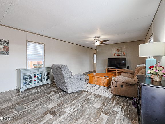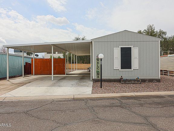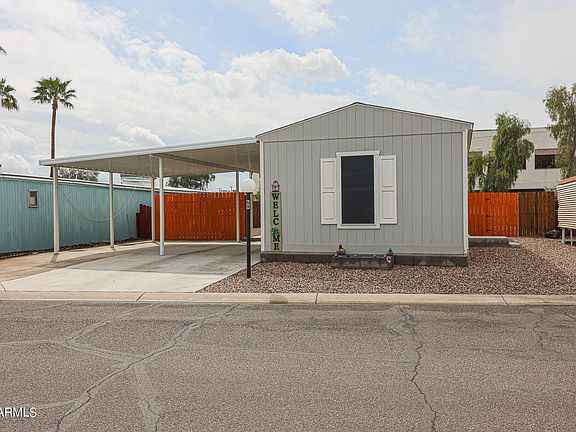 Welcome to this charming 3 bedroom, 2 bathroom mobile home located in the desirable, all ages Polynesian Village mobile park in Peoria, AZ! This home offers a cozy and comfortable living space. As you enter the home, you are greeted by a spacious living room with large windows that allow natural light to flow in. The living room leads to an open-concept kitchen with ample storage space, modern appliances, and a convenient breakfast bar, perfect for quick meals on the go. The home features three bedrooms, including a primary bedroom with an ensuite bathroom. The other two bedrooms share a full bathroom. Separate laundry room with plenty of storage space, adding convenience to your daily routine. Outside, you'll find a covered porch area and low maintenance yard. This is leased land.