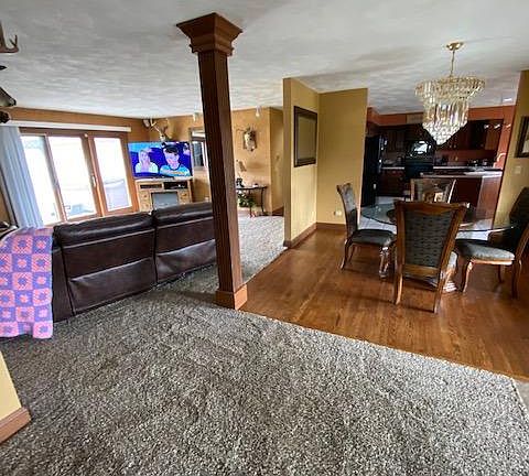 Custom built ranch on 5 acres! 3 bedroom/2.5 Baths could use room in basement as 4th bedroom. 9x9 Walk-in closet in Master bdrm. Cherry woodwork with cherry cabinets,alarm system, central vac.,pool table, safe room and bar in basement. Detached garage has 3 garage bays with man cave with a gas fireplace and a full bath-45x70. Roof is 5 years old.