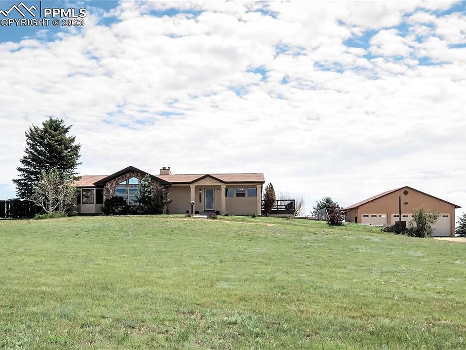 Gorgeous custom built ranch stucco home in highly desired Paint Brush Hills with 2 car garage attached and a bonus oversized 3 car detached garage! The potential is endless. 2.76 acres with a bonus storage shed, pergola and a large wrap-around trex deck to enjoy those stunning mountain views. Home is on well and septic. Recently updated large central kitchen with beautiful high end cabinets, quartz counters, double oven, gas cooktop, SS appliances, huge kitchen island, walk in pantry and TONS of storage! This home is a must see! Living room has vaulted ceilings, stunning windows and a massive stone wall with wood fireplace and several special features. The skylights and abundance of windows throughout the main level lets the natural light pour in! Large master suite with oversized 5 piece bath and a spacious master closet with great built-ins for all your storage needs. Office has built in wood cabinets and shelving. The finished basement features 2 large bedrooms and a bonus flex room/recreation room. Part of the property is fenced for pets and and fenced in garden area. The property is also zoned for horses. Do not miss this opportunity, set up your showings today!