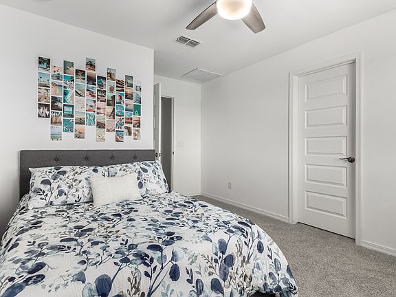 Stunning 5-bedroom, 3-bath home that feels nearly brand new! Features luxury vinyl plank flooring throughout, and upgraded lighting fixtures throughout. The grand entry with elevated ceilings leads you into the heart of the home. A full bedroom and bathroom are conveniently located on the main floor perfect for guests! The chef's kitchen boasts sleek white cabinetry, quartz countertops, a large single-basin sink, island with bar seating, and a spacious walk-in pantry. The open-concept great room is ideal for entertaining. One of the rooms is located near the entry, features elegant French doors. Upstairs, the expansive primary suite includes an ensuite bath with double sinks and a generous walk-in closet filled with natural light. Three additional guest bedrooms, each featuring spacious walk-in closets. The backyard is inviting, with a lush grassy area and a charming stone border, lined with plants. Relax or entertain on the extended paver patio.