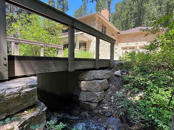 Cross the private bridge to this one of a kind stone home at the top of Spearfish Canyon with a live creek flowing right past the front covered patio. Walk to Cheyenne Crossing. Interior craftsmanship epitomizes timeless class with no details spared. Gourmet chef's kitchen with stainless steel and granite. The custom-tiled bathrooms, clawfoot tub, walk-in showers & unique stained glass windows and light fixtures evoke 19th-century luxury. 3 fireplaces (2 gas and 1 wood) guarantee your memory-making stays warm and cozy. State snowplows keep winter access from well-maintained Highway 14A fronting property. Fully restored separate bonus cabin (Spearfish Canyon Cabin No. 1) for totally unique guest quarters.